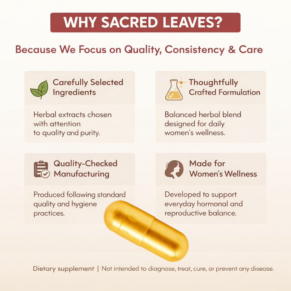 The product supports endocrine function and overall well-being through plant-based adaptogenic and phytoestrogenic mechanisms.