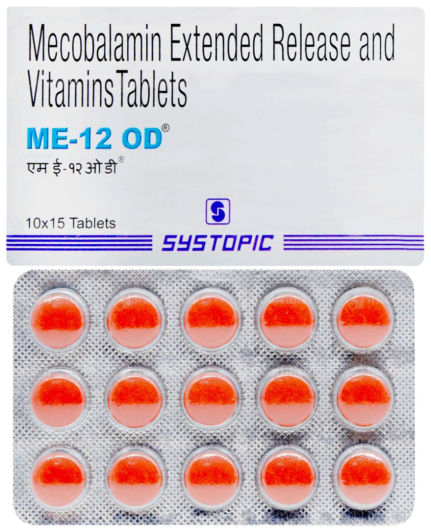 Комплекс ME-12 OD содержит активную форму витамина B12 — метилкобаламин, который участвует в восстановлении миелиновых оболочек нервов и кроветворении. Пиридоксин (B6) необходим для синтеза нейротрансмиттеров, а фолиевая кислота поддерживает здоровье клеток крови и обмен веществ.